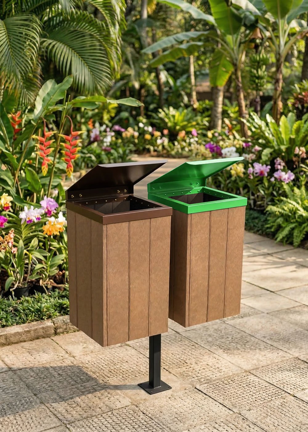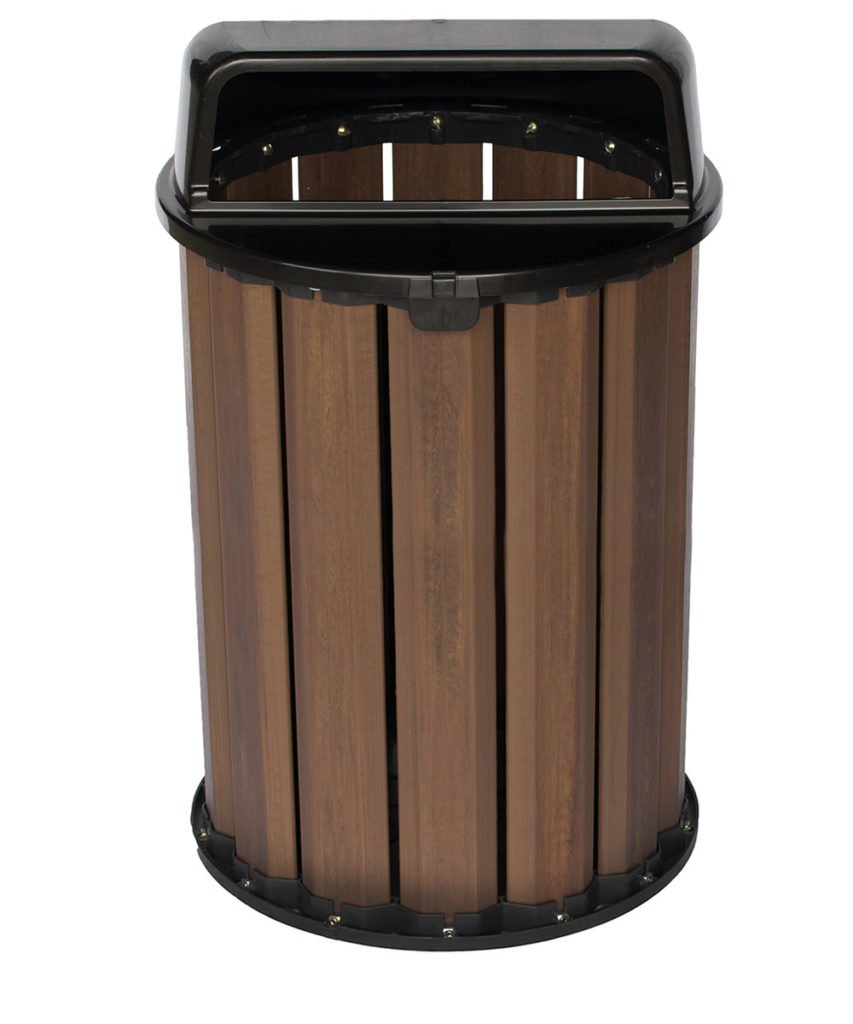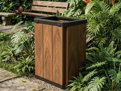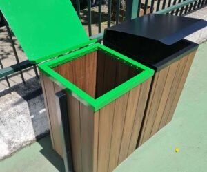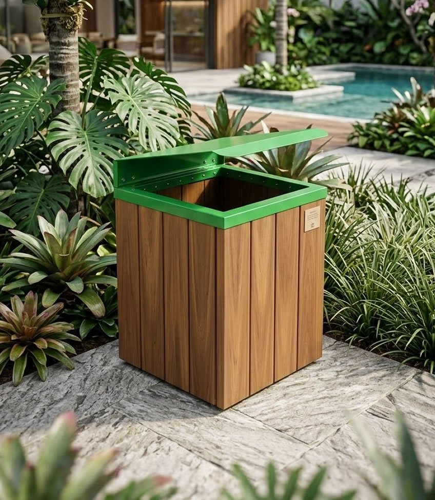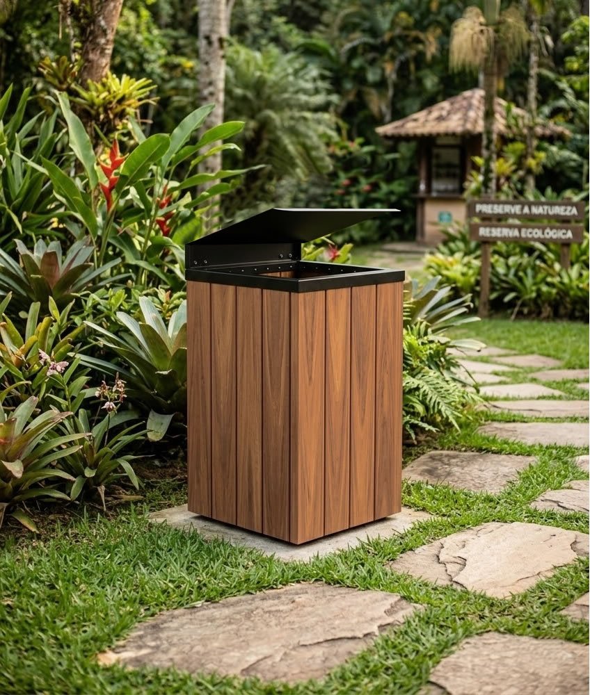 - As lixeiras da linha Steel e Steel Baú são compostas por réguas de madeira plástica maciça com a base e tampas / aros em aço e pintadas com processo de tinta a pó (pintura eletrostática). Possuem alta durabilidade mesmo exposta a intempéries. Essa linha é feita de forma artesanal, sendo assim é possível fazer pequenas mudanças em seu projeto original a fim de atender condomínios e prefeituras caso sintam a necessidade de alguma alteração em seu layout, bem como suas cores.