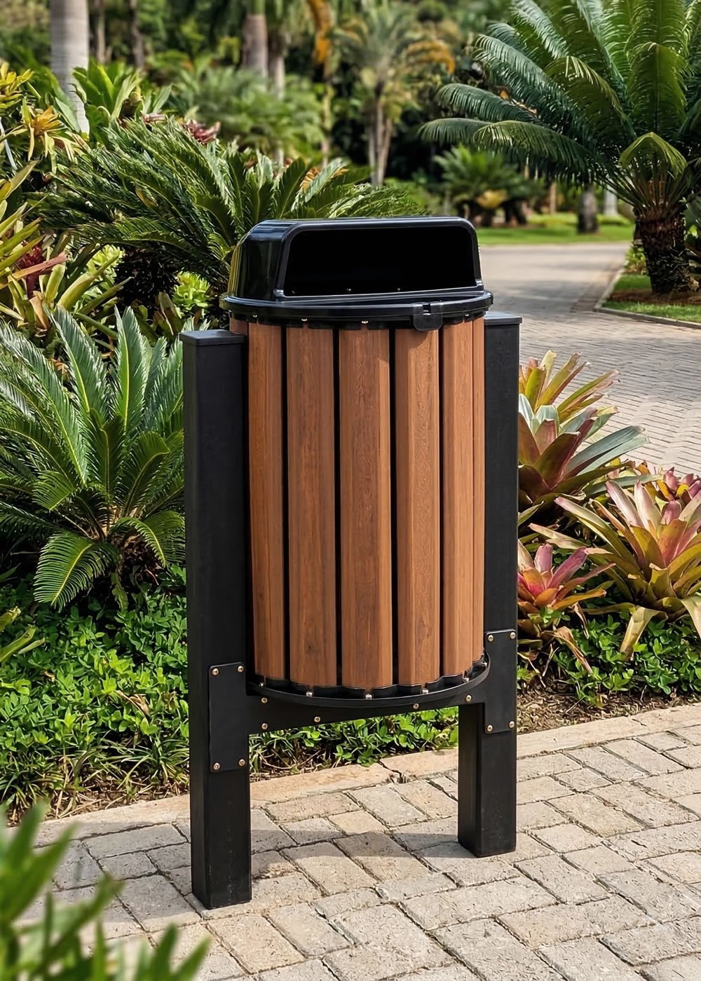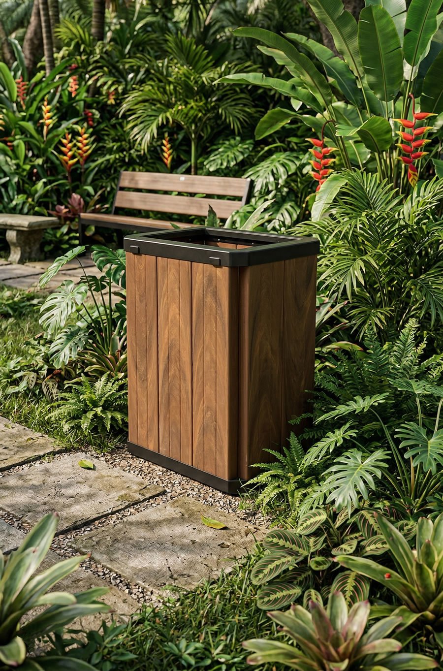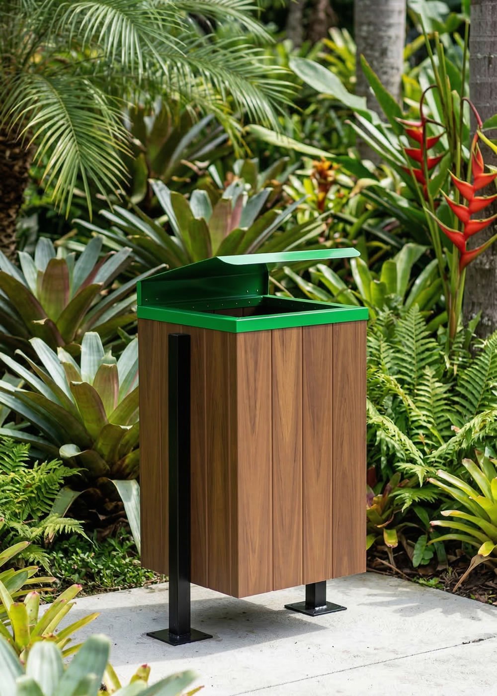 - As lixeiras da linha Steel e Steel Baú são compostas por réguas de madeira plástica maciça com a base e tampas / aros em aço e pintadas com processo de tinta a pó (pintura eletrostática). Possuem alta durabilidade mesmo exposta a intempéries. Essa linha é feita de forma artesanal, sendo assim é possível fazer pequenas mudanças em seu projeto original a fim de atender condomínios e prefeituras caso sintam a necessidade de alguma alteração em seu layout, bem como suas cores.