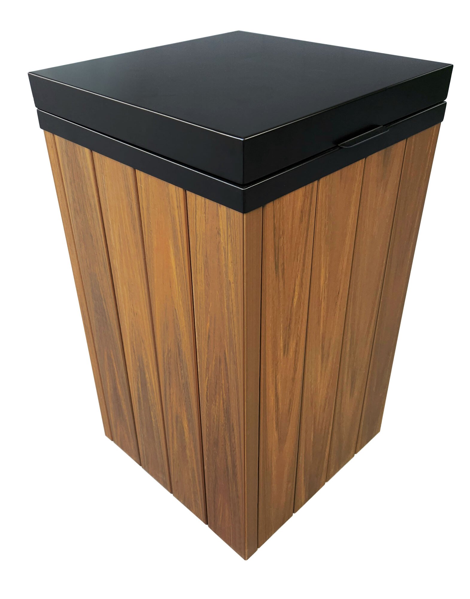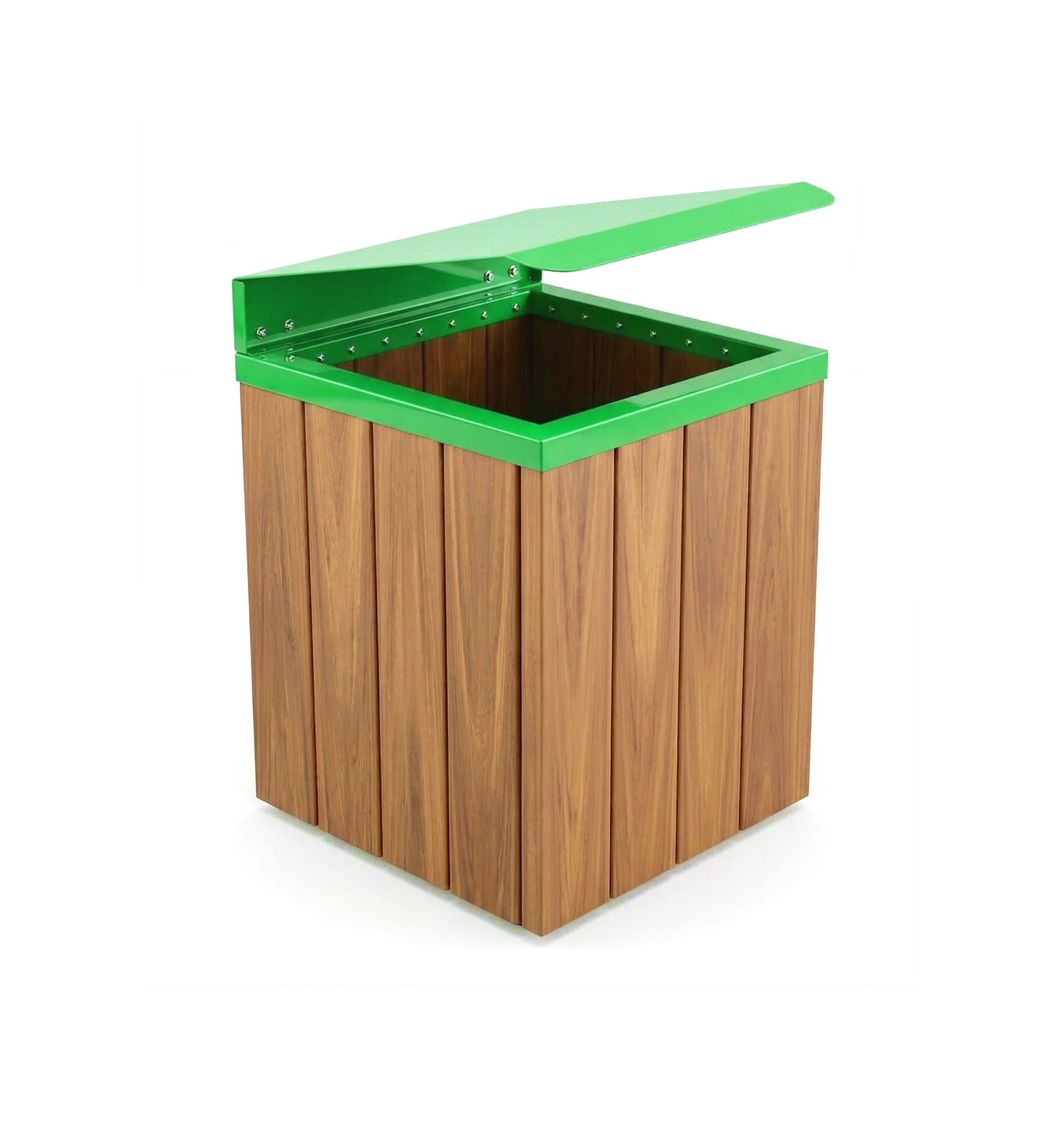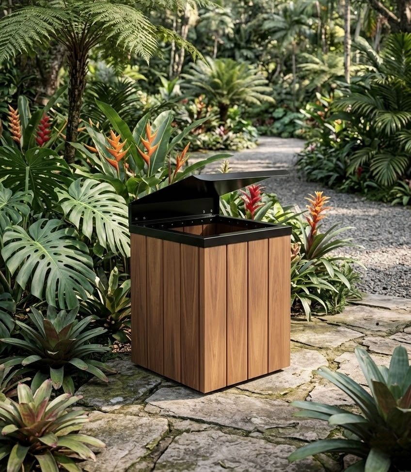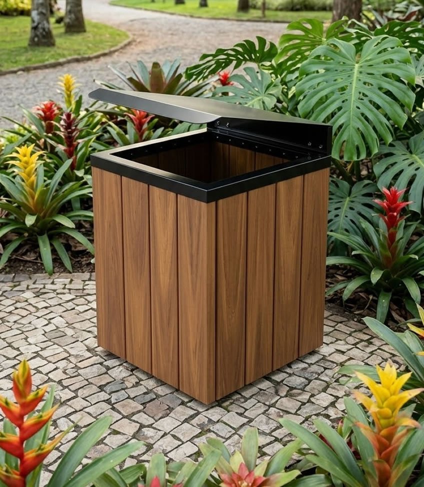 A linha Baú de lixeiras é feita para quem busca um modelo com tampa fechada. Sua estrutura é em madeira plástica encapsulada (perfis de 100x32mm) na cor ipê e aro com tampa basculante em aço carbono com pintura elestrostática. Nessa linha você encontra no tamanho de 77cm e diversas cores. Conheça nossos modelos: