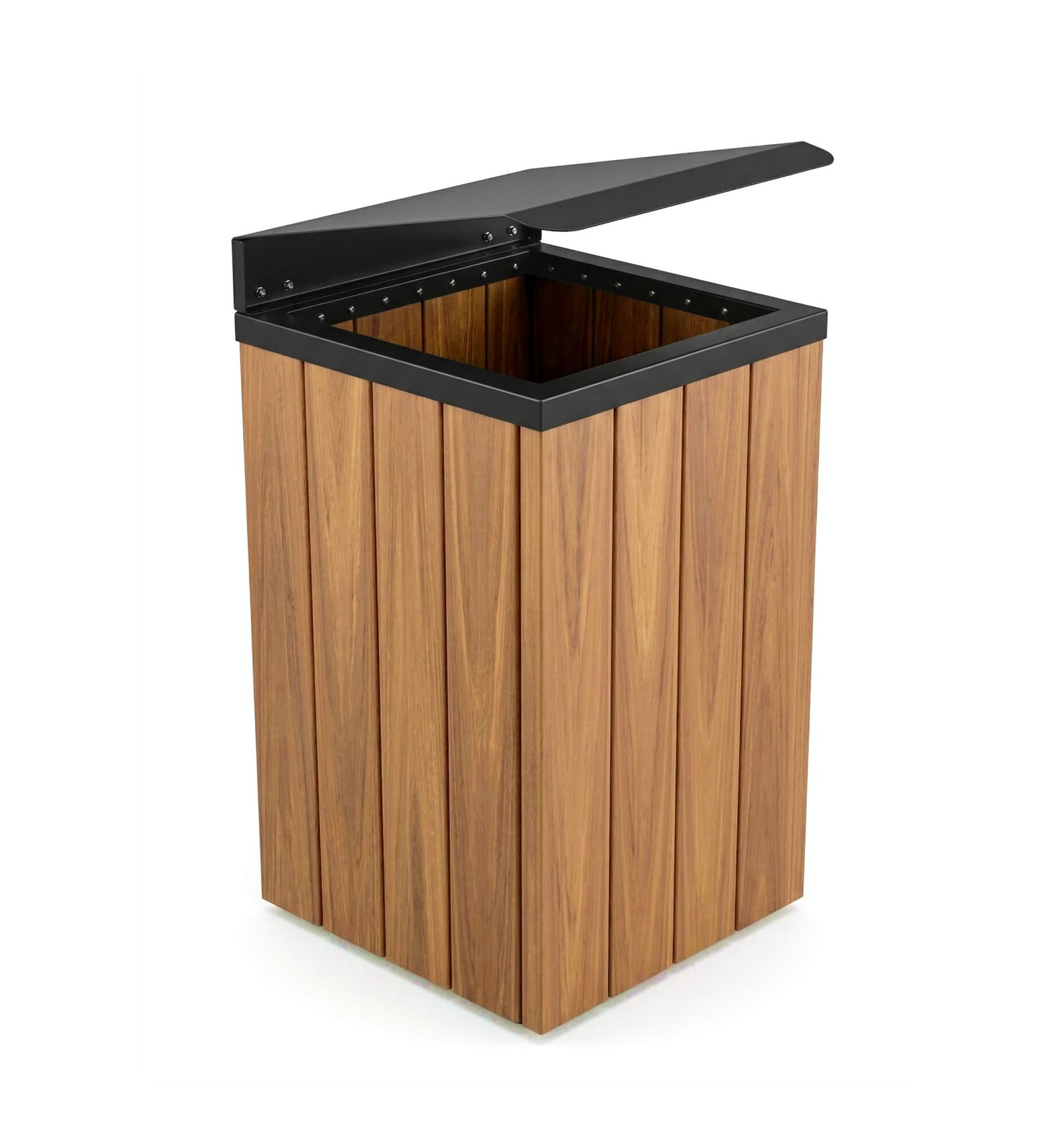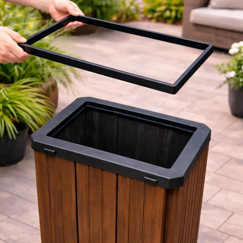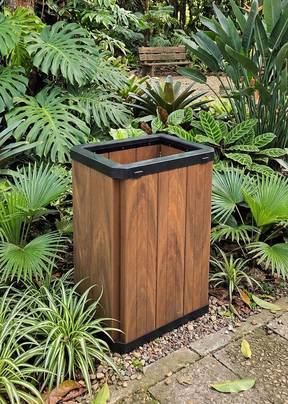 Utilizamos como estrutura da lixeira réguas de Madeira Plástica, seja nos modelos com perfis maciços ou encapsulada, o que possibilita acabamentos diferentes. As tampas e bases você pode escolher com material plástico ou em aço de carbono.